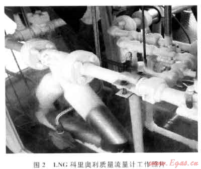 LNG流量計是整個LNG加氣機的核心部件。流量計的選型直接影響LNG加氣機的性能。根據(jù)以往石油和天然氣貿(mào)易交接應(yīng)用中所用的流量計量方法,最合理的LNG流量測量計包括:差壓(孔板式)流量計、渦輪流量計、超聲波流量計和科里奧利質(zhì)量流量計,其中差壓流量計和渦輪流量計是得到公認的傳統(tǒng)技術(shù),但用其來測量低溫的LNG時卻存在一些困難:差壓裝置和渦輪流量計都會使流量管內(nèi)的壓力大大降低,這可能導致LNG氣化;差壓流量計還要求管道上游和下游為長距離直線型布局,計量的流量范圍不廣。而超聲波流量計和科里奧利質(zhì)量流量計被視為新技術(shù),得到了美國石油學會(API)、美國天然氣協(xié)會(AGA)和國際法制計量組織(OIML)的認可,但在LNG貿(mào)易交接過程中使用超聲波流量計仍存在一些問題,而科里奧利質(zhì)量流量計是目前應(yīng)用最成功的LNG流量計。圖2所示的即為使用中的LNG科里奧利質(zhì)量流量計。目前,美國艾默生旗下的高準公司生產(chǎn)的CMF系列質(zhì)量流量計和Endress+Hauser公司生產(chǎn)的83F低溫型質(zhì)量流量計以其耐低溫和性能穩(wěn)定的優(yōu)點得到了LNG加氣機行業(yè)的認同。但是,LNG加氣機在加液過程中難免會發(fā)生LNG的部分氣化,氣液兩相的存在對科里奧利質(zhì)量流量計的計量精度影響很大,其中氣相流量計量的準確性對加氣機計量精度有著至關(guān)重要的影響,目前科里奧利質(zhì)量流量計液相計量的精度可達±0.10%,而氣相計量的精度只有±0.35%,這是需要進一步解決的技術(shù)難題[4]。