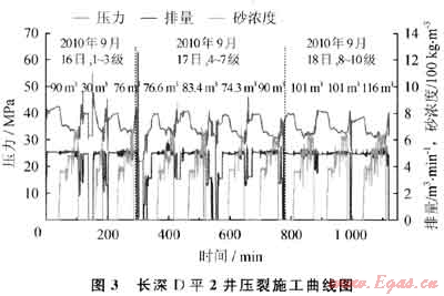 長深D平2井壓裂施工歷時3d,創(chuàng)造了中國石油壓裂史上的3項紀錄:①水平井深層氣井壓裂級數(shù)最多(10段);②單井總壓裂規(guī)模最大(838m3);③單級壓裂規(guī)模最大(116m3)(圖3)。
