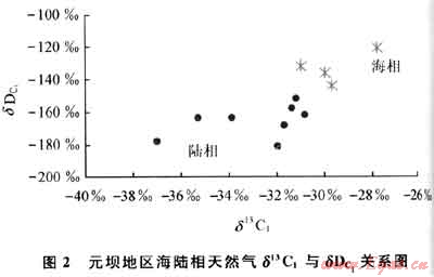 根據(jù)前人對甲烷氫同位素的研究,通常認(rèn)為烷烴氣的氫同位素首先制約于沉積環(huán)境,其次才是成熟度的影響。Schoell提出天然氣氫同位素組成隨烴源巖熱演化程度的增加變重,陸相淡水環(huán)境生成的熱成因甲烷的氫同位素組成小于-190‰,海相環(huán)境生成的甲烷的氫同位素組成大于-190‰[1]。沈平等研究發(fā)現(xiàn)中國陸相盆地天然氣甲烷的氫同位素組成介于-255‰~-158‰,其中海陸交互相的半咸水環(huán)境中生成的甲烷氫同位素值(δD)亦大于-190‰,而湖相、沼澤相的淡、微咸水環(huán)境生成的生物甲烷δD值一般小于-200‰[2~5]。王曉峰等對塔里木盆地海相和陸相環(huán)境生成的天然氣甲烷氫同位素進行研究后發(fā)現(xiàn),二者基本以-170‰為界[3~6]。錢志浩等認(rèn)為,四川盆地天然氣由于成熟度和共存水的影響,海陸相天然氣甲烷8D的劃分界限以-160‰為宜[6]。