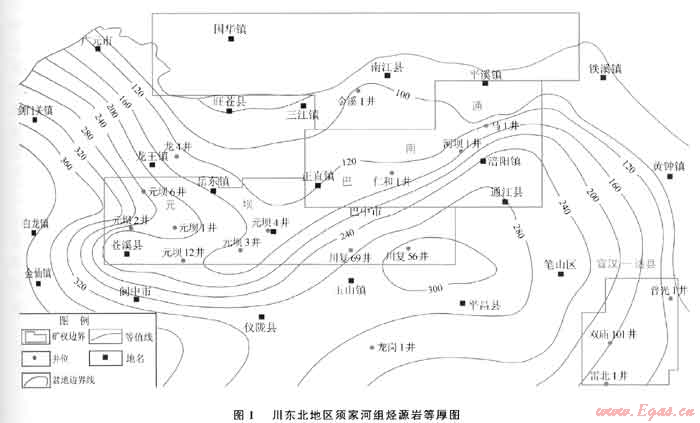 前期研究表明,川東北陸相發(fā)育上三疊統(tǒng)須家河組、下侏羅統(tǒng)自流井組、下侏羅統(tǒng)千佛崖組3套主力烴源巖。其中,須家河組時期,存在閬中-南部地區(qū)及宣漢達州西北緣兩個生烴中心,元壩地區(qū)須家河組烴源巖厚度介于160~220m(圖1);自流井組時期同樣存在兩個生烴中心,分別位于元壩-閬中地區(qū)和宣漢-達州北緣,元壩地區(qū)自流井組烴源巖厚度介于160~260m;而千佛崖組時期的生烴中心則位于宣漢-達州地區(qū),元壩地區(qū)該期烴源巖厚度介于120~140m。