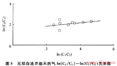 自流井組天然氣ln(C2/C3)值變化很小(處于數(shù)值2附近),在ln(C2/C3)—ln(C1/C2)關(guān)系圖上基本呈一水平直線;而ln(C1/C2)值變化較大(介于2~5)。由此,可以判斷元壩地區(qū)自流井組天然氣主要屬于干酪根裂解氣類型(圖5)??紤]到元壩地區(qū)自流井組天然氣相對較濕、重?zé)N含量較高的特點及地質(zhì)特征,綜合研究認(rèn)為該區(qū)可能存在少量的原油二次裂解氣。