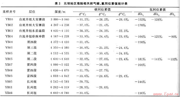 由圖2中可見,元壩地區(qū)海相長興組及飛仙關(guān)組的4個樣品點均落在右上角,甲烷氫同位素值(δD)大于-150%o;而雷口坡組及以上陸相地層樣品點則位于左下角,其δD普遍小于-150‰。由于二疊系為海相沉積環(huán)境,海水鹽度高,而陸相多為湖泊、沼澤相的淡水或微咸水沉積環(huán)境,水體鹽度低,加之下伏二疊系熠源巖比上覆陸相烴源巖具有更高的演化程度,因此,該區(qū)海陸相天然氣甲烷氫同位素值應(yīng)該同時受古沉積環(huán)境和演化程度的影響,結(jié)果導(dǎo)致天然氣的δD存在明顯差異。當(dāng)然,母質(zhì)類型也是影響氫同位素分餾效應(yīng)的因素之一。