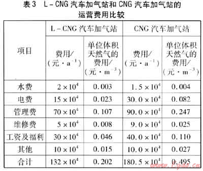 L-CNG汽車加氣站與CNG汽車加氣站的運(yùn)營(yíng)費(fèi)用比較見表3。