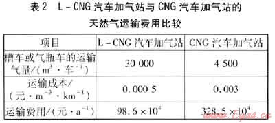 由于加氣站總運(yùn)營(yíng)費(fèi)用的90%以上是用于購(gòu)買和運(yùn)輸天然氣,因此從氣源點(diǎn)到加氣站的運(yùn)輸成本對(duì)加氣站的運(yùn)行費(fèi)用產(chǎn)生很大影響,進(jìn)而影響加氣價(jià)格。L-CNG汽車加氣站與CNG汽車加氣站的天然氣運(yùn)輸費(fèi)用比較見表2。