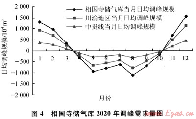 天然氣消耗的季節(jié)不均勻性主要體現(xiàn)為冬夏季用氣不平衡,通常冬季用氣量遠(yuǎn)遠(yuǎn)超過(guò)夏季用氣量。根據(jù)天然氣市場(chǎng)需求預(yù)測(cè)的逐年城市燃?xì)饬恳约俺鞘腥細(xì)獾脑虏痪鶆蛳禂?shù)可以計(jì)算出市場(chǎng)需求的城市燃?xì)饧竟?jié)調(diào)峰氣量,從而得出正常情況下長(zhǎng)輸管道逐年夏季的逐月剩余氣量(即注氣調(diào)峰量)及冬季逐月需要補(bǔ)充氣量(即采氣調(diào)峰量)。相國(guó)寺地下儲(chǔ)氣庫(kù)計(jì)算的2020年逐月季節(jié)調(diào)峰需求量如圖4所示,圖中負(fù)值表示注氣調(diào)峰,正值表示采氣調(diào)峰。