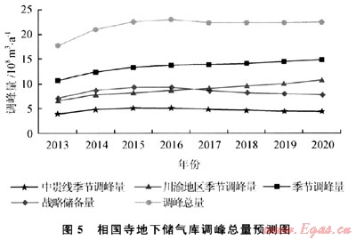 季節(jié)調(diào)峰需求量和戰(zhàn)略?xún)?chǔ)備需求量構(gòu)成了季節(jié)調(diào)峰型地下儲(chǔ)氣庫(kù)的調(diào)峰總需求量(只要滿(mǎn)足戰(zhàn)略?xún)?chǔ)備即可滿(mǎn)足應(yīng)急供氣要求)。相國(guó)寺地下儲(chǔ)氣庫(kù)調(diào)峰總量計(jì)算結(jié)果如圖5所示。