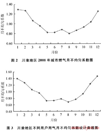 根據(jù)GB 50028—2006《城鎮(zhèn)燃?xì)庠O(shè)計(jì)規(guī)范》,月不均勻系數(shù)指計(jì)算月的日平均用氣量和年的日平均用氣量之比。應(yīng)根據(jù)用戶(hù)前幾年逐月的用氣情況進(jìn)行統(tǒng)計(jì),計(jì)算用戶(hù)的月不均勻系數(shù),同時(shí)在設(shè)計(jì)時(shí)充分預(yù)留,以便保障用氣高峰時(shí)期的供氣平穩(wěn)性和安全性。圖2為川渝地區(qū)2008年城市燃?xì)庠虏痪鶆蛳禂?shù)圖,圖3為川渝地區(qū)不同用戶(hù)用氣月不均勻系數(shù)設(shè)計(jì)曲線圖。由圖2、3可知,川渝地區(qū)2008年的最大月不均勻系數(shù)為1.25,為了保障安全,設(shè)計(jì)取值為1.50[7]。