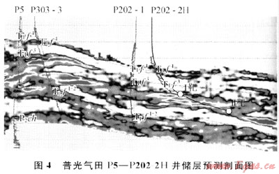 普光氣田目前已完鉆6口水平井,鉆遇氣層厚度介于398.6~623.5m之間,均達(dá)到或超過(guò)設(shè)計(jì)指標(biāo)。如P202-2H井,原為部署在P202井臺(tái)上的1口定向井,根據(jù)該井臺(tái)上P202-1井(直井)實(shí)施情況及儲(chǔ)層預(yù)測(cè)結(jié)果(圖4),該井區(qū)氣層厚度介于120~150m,且縱向上分布比較集中,適合打水平井,因而重新進(jìn)行了井型優(yōu)化。該井設(shè)計(jì)水平段長(zhǎng)470m,鉆遇氣層厚度602m,比設(shè)計(jì)為斜井多鉆氣層400m。2009年5月,該井投產(chǎn)試氣,射開(kāi)氣層558m,測(cè)試無(wú)阻流量686×104m3/d。