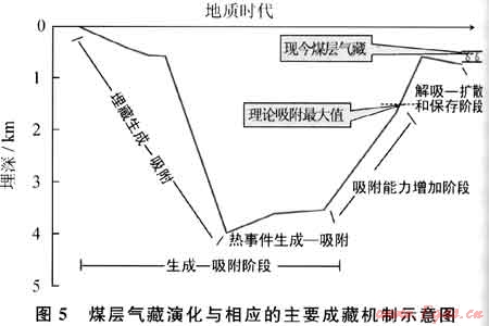 煤層氣成藏演化伴隨著煤層的沉積、埋藏變質(zhì)和抬升的演化過程。我國(guó)除變質(zhì)程度較低的含煤盆地外,絕大多數(shù)含煤盆地都經(jīng)歷了沉降和回返抬升演化階段,有的盆地甚至經(jīng)歷了多次的旋回。煤層的埋藏-抬升決定了煤層氣的成藏演化經(jīng)歷生成和吸附、吸附能力增加和解吸、擴(kuò)散、保存階段(圖5)。保存條件是控制現(xiàn)今煤層氣富集的關(guān)鍵,現(xiàn)今煤層氣藏的形成取決于構(gòu)造控藏關(guān)鍵時(shí)刻。這一關(guān)鍵時(shí)刻不等同于常規(guī)天然氣成藏的關(guān)鍵時(shí)刻,它是指地質(zhì)歷史時(shí)期煤層生烴終止后具有最小埋藏深度的時(shí)間。