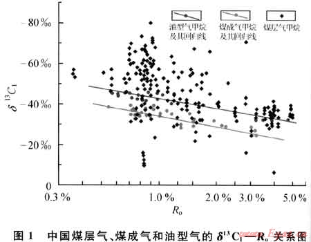 天然氣的甲烷碳同位素值主要受控于原始母質(zhì)類型和后期改造程度,煤層氣與常規(guī)天然氣碳同位素值的差異主要是由于煤層氣具有獨(dú)特的后期改造特征。常規(guī)天然氣甲烷碳同位素值主要受到母質(zhì)和烴源巖熱演化程度(Ro)的影響,相同成熟度條件的烴源巖,煤成氣比油型氣的δ13C1要重,同一母質(zhì)類型的天然氣δ13C1隨著成熟度的增加而變重(圖1);常規(guī)天然氣的后期改造,除典型生物氣外,我國(guó)已發(fā)現(xiàn)的大中型煤成氣氣藏受到生物降解的影響較小,對(duì)甲烷碳同位素值的影響不大。而煤層氣,由于氣源來自煤巖本身,甲烷碳同位素值除了受烴源巖成熟度影響外,后期的解吸作用、生物作用和水動(dòng)力作用是主要的影響因素。煤層氣為吸附氣,后期吸附解吸過程中,13CH4比12CH4難解吸,從而發(fā)生同位素的分餾效應(yīng),造成同位素值的變化[32];目前工業(yè)開采利用的煤層氣藏一般埋深淺于2000m,生物降解作用使得烴源巖成熟度相近的煤層氣較常規(guī)煤成氣的甲烷碳同位素值偏輕[28,33~34];煤層氣受水動(dòng)力條件影響也較大,其作用機(jī)制為甲烷通過水溶作用而改變同位素的組成[35]。