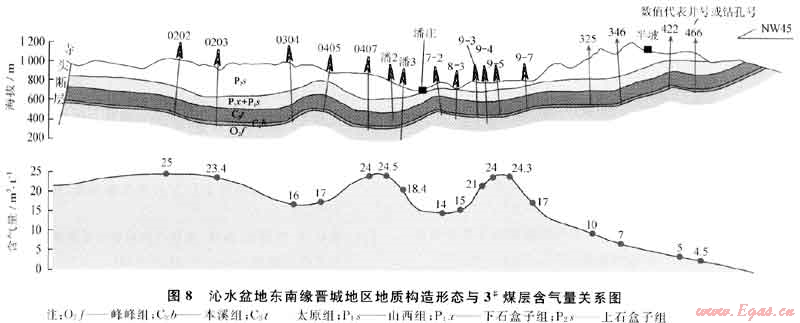 5) 在成藏機(jī)制上,煤層氣的聚集受水勢(shì)和壓力的控制,往往具有向斜富集的特征;常規(guī)天然氣聚集受氣勢(shì)的控制,往往具有背斜或高部位富集的特征。