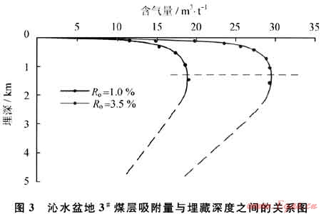 因此,影響煤層吸附能力的主要因素是煤階、溫度和壓力。在正常地溫梯度下,埋深1500m以淺的煤層吸附能力主要受壓力控制,在這個(gè)深度范圍煤層吸附能力達(dá)到最大值之后隨著埋深加大含氣量具有降低的趨勢(shì)(圖3)[39]。因此,煤層含氣量主要受到溫度壓力場(chǎng)的控制。