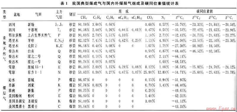 2) 在地球化學(xué)成分上,煤層氣與常規(guī)天然氣的主要差別在于煤層氣組分較為簡(jiǎn)單,以甲烷為主,重?zé)N氣和非烴氣含量較少,為干氣或特干氣,甲烷碳同位素值偏輕;而常規(guī)天然氣成分相對(duì)復(fù)雜,甲烷含量變化較大,重?zé)N氣也相對(duì)較多,甲烷碳同位素值偏重。