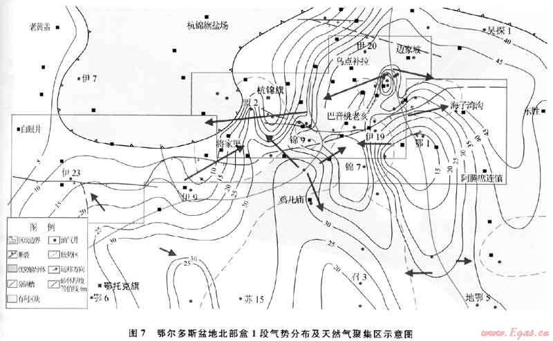 常規(guī)油氣圈閉機(jī)制是在儲(chǔ)層中有被油氣高等勢(shì)面封閉形成的油氣低勢(shì)區(qū),這種低勢(shì)區(qū)是一個(gè)孔隙、滲透性巖體,是聚集、保存油氣的場(chǎng)所,位置具有明顯的可預(yù)測(cè)性。這說明,常規(guī)油氣的聚集取決于油氣勢(shì)的太小,高部位一般具有低油氣勢(shì),是油氣運(yùn)移的指向,目此,常規(guī)油氣主要聚集于背斜構(gòu)造。常規(guī)天然氣在運(yùn)移過程中主要受浮力、毛細(xì)管力和地層水的水動(dòng)力3種作用力的共同控制。天然氣在地層中不同位置的勢(shì)能不同,由于氣勢(shì)梯度的存在,天然氣會(huì)沿著氣勢(shì)減』、的最大方向(負(fù)氣勢(shì)梯度方向)從高氣勢(shì)區(qū)向低氣勢(shì)區(qū)運(yùn)移(圖6)。運(yùn)移的結(jié)果是天然氣進(jìn)入自身勢(shì)能最1、的區(qū)域后不再發(fā)生運(yùn)移,達(dá)到平衡狀態(tài)后聚集成藏。如通過對(duì)鄂爾多斯盆地北部二疊系石盒子組盒1段氣勢(shì)的分析發(fā)現(xiàn),天然氣聚集區(qū)主要發(fā)育于低氣勢(shì)區(qū)(圖7)。
