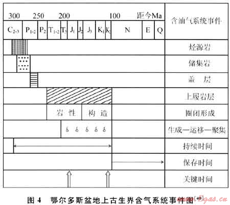 常規(guī)天然氣的成藏演化過程一般經(jīng)歷3個(gè)階段:生成階段、運(yùn)移和聚集階段、保存和破壞階段。氣藏演化不一定經(jīng)歷晚期抬升過程,烴源巖、儲(chǔ)層和蓋層等靜態(tài)要素和天然氣生成、運(yùn)移、圈閉形成和成藏等過程的動(dòng)態(tài)地質(zhì)作用的最佳時(shí)空匹配是其成藏的關(guān)鍵。如鄂爾多斯盆地上古生界天然氣成藏要素及地質(zhì)作用的最佳匹配時(shí)間(關(guān)鍵時(shí)刻)是早侏羅世和晚白堊世[40](圖4)。