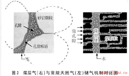 常規(guī)天然氣儲(chǔ)層主要發(fā)育于烴源巖圍巖中,具有明顯的生儲(chǔ)蓋縱向組合,而煤層氣的儲(chǔ)層就是煤層本身,從而造就了兩者在儲(chǔ)集機(jī)理和氣藏特征上的差異。