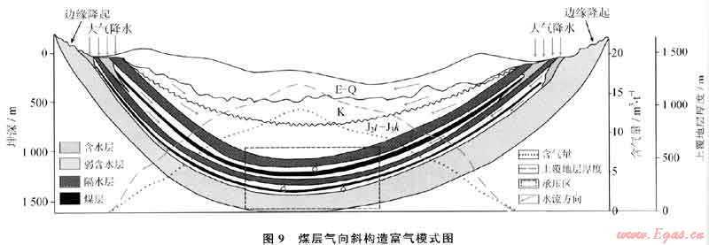 通過對(duì)國(guó)內(nèi)外煤層氣富集規(guī)律的研究,發(fā)現(xiàn)了自斜構(gòu)造富集煤層氣這一普遍特點(diǎn),如美國(guó)圣湖安盆地、我國(guó)沁水盆地等都可見到這一現(xiàn)象[41~43](圖8)。煤層氣向斜富集規(guī)律并非偶然,取決于煤層氣特殊的賦存方式。由于煤層氣的賦存絕大部分是吸附氣,煤吸附煤層氣屬于物理吸附,從Langmuir等溫吸附方程可知,煤的吸附量隨壓力增大而增大。因此,要保持煤層中有足夠大的吸附量,低水勢(shì)和高壓力是主要的前提條件。向斜軸部位于地層下傾部位,地層水位低,使煤層處于承壓水環(huán)境,壓力得到保存;另一方面,向斜軸部一般位于盆地深部,靜水壓力較大,具有較高的地層壓力。因此,由于水勢(shì)和壓力的共同作用,使向斜軸部不僅可以保持較高的壓力條件滿足煤層的最大吸附,而且大氣滲入水體在軸部形成向心流,也能起到水封的效果,對(duì)煤層氣的保存有利,在向斜部位更容易吸附煤層氣而富集成藏。
