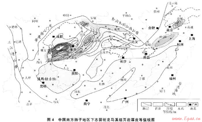 —O1s)。揚(yáng)子地區(qū)的寒武系頁(yè)巖形成于早寒武世,厚度大,分布范圍遍及整個(gè)揚(yáng)子地臺(tái)區(qū)(圖3),是麻江、凱里等古油藏及威遠(yuǎn)氣田的主要烴源巖。塔里木盆地寒武紀(jì)在早期和晚期各發(fā)育一套頁(yè)巖,在柯平、塔里南、塔中隆起、塔北隆起、滿加爾坳陷等區(qū)域廣泛分布,是塔里木盆地的重要烴源巖。志留紀(jì)頁(yè)巖在揚(yáng)子地區(qū)發(fā)育較好,以早直留世龍馬溪組頁(yè)巖為主,分布于整個(gè)揚(yáng)子地區(qū)(圖4),是四川盆地五百梯、羅家寨、建南等石灰系氣田的主力烴源巖。此外,在鄂爾多斯盆地西緣、塔里木盆地還發(fā)育有中-上奧陶統(tǒng)平?jīng)鼋M(O2p)、印干組(O3y)頁(yè)巖,在黔南-桂中地區(qū)發(fā)育有泥盆系印堂-羅富組(D2-3y-l)頁(yè)巖,在滇東北發(fā)育了石灰系舊司組(C1j)頁(yè)巖。古生代海相富有機(jī)質(zhì)頁(yè)巖是中國(guó)頁(yè)巖氣勘探首選領(lǐng)域,除四川盆地、塔里木盆地等構(gòu)造穩(wěn)定的地臺(tái)區(qū)頁(yè)巖保存較好外,其余都處于現(xiàn)今盆地之外,遭受多次構(gòu)造改造或大面積裸露,評(píng)價(jià)這些區(qū)域的頁(yè)巖氣潛力,尋找相對(duì)穩(wěn)定、保存較好的頁(yè)巖區(qū)帶,將是中國(guó)頁(yè)巖氣勘探需要攻克的一個(gè)重大難題。