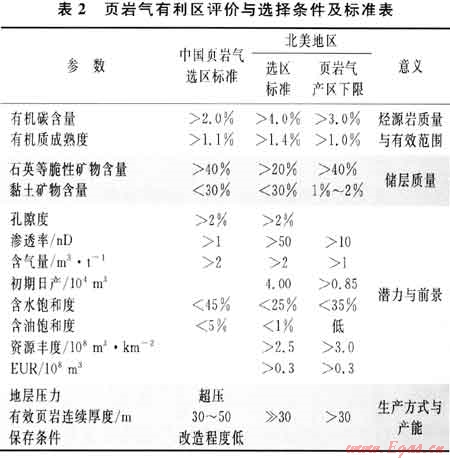 在含油氣區(qū),頁(yè)巖氣的存在具有普遍性,只是由于埋藏深度、含氣程度等經(jīng)濟(jì)、技術(shù)條件的差別,使其部分具有工業(yè)價(jià)值,部分暫無(wú)工業(yè)價(jià)值。對(duì)比北美頁(yè)巖氣產(chǎn)區(qū)與中國(guó)頁(yè)巖氣勘探實(shí)踐,形成工業(yè)價(jià)值頁(yè)巖氣基本地質(zhì)條件為(表2)[6]:富有機(jī)質(zhì)頁(yè)巖必須具備較高有機(jī)質(zhì)豐度(TOC>2.00%)、高熱成熟度(Ro>1.1%),高脆性(石英、長(zhǎng)石等礦物含量大于40%)、低黏土礦物含量(小于30%)、有效頁(yè)巖(Hot Shale)厚度超過(guò)30m或50m、成氣后保存條件較好、存在超壓。