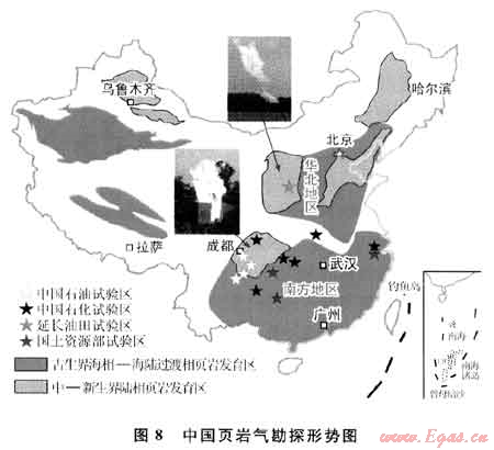 中國(guó)政府對(duì)中國(guó)頁(yè)巖氣勘探給予了高度重視。2009年中國(guó)與美國(guó)簽署了《中美關(guān)于在頁(yè)巖氣領(lǐng)域開(kāi)展合作的諒解備忘錄》,國(guó)土資源部設(shè)立了“全國(guó)頁(yè)巖氣資源潛力調(diào)查評(píng)價(jià)及有利區(qū)優(yōu)選”重大專項(xiàng);2010年中國(guó)與美國(guó)制訂并簽署了《美國(guó)國(guó)務(wù)院和中國(guó)國(guó)家能源局關(guān)于中美頁(yè)巖氣資源工作行動(dòng)計(jì)劃》、成立了國(guó)家能源頁(yè)巖氣研發(fā)(實(shí)驗(yàn))中心;2011年科技部在油氣重大專項(xiàng)中設(shè)立《頁(yè)巖氣勘探開(kāi)發(fā)關(guān)鍵技術(shù)》項(xiàng)目,國(guó)家發(fā)展和改革委員會(huì)等多部委聯(lián)合編制了中國(guó)頁(yè)巖氣“十二五”勘探開(kāi)發(fā)規(guī)劃。目前,中國(guó)已在陸上廣泛開(kāi)展了頁(yè)巖氣前期地質(zhì)評(píng)價(jià)和勘探開(kāi)發(fā)先導(dǎo)試驗(yàn),初步明確了上揚(yáng)子區(qū)古生界海相富有機(jī)質(zhì)頁(yè)巖為中國(guó)陸上頁(yè)巖氣勘探最有利領(lǐng)域。據(jù)不完全統(tǒng)計(jì)(圖8),中國(guó)已在陸上四川、鄂爾多斯、渤海灣、沁水、泌陽(yáng)等盆地,云南昭通、貴州大方、建南、銅仁等地區(qū)開(kāi)展了頁(yè)巖氣鉆探與水力壓裂試氣,完鉆頁(yè)巖氣井35口(其中水平井5口),水力壓裂試氣井14(氣中水平井2口),獲工業(yè)氣(油)流井11口(其中水平井1口),初產(chǎn)超過(guò)1×104m3/d氣井7口。四川盆地、云南昭通實(shí)現(xiàn)了古生界海相頁(yè)巖氣的突破;四川盆地、鄂爾多斯盆地陸相頁(yè)巖氣見(jiàn)到良好顯示;泌陽(yáng)盆地陸相頁(yè)巖油勘探也取得了進(jìn)展。