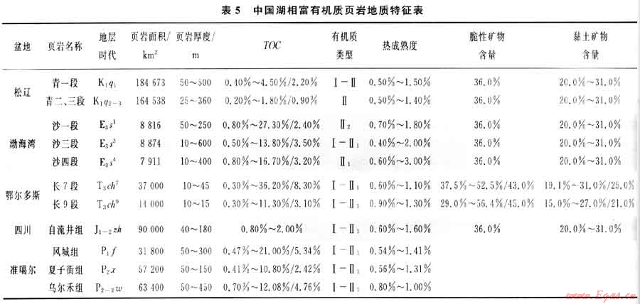 4) 湖相富有機(jī)質(zhì)頁(yè)巖總厚度大,有機(jī)碳含量高,熱成熟度低,頁(yè)巖成巖作用低,黏土礦物中水敏礦物含量多,有利區(qū)以盆地中心或埋深較大地區(qū)為主,開(kāi)采技術(shù)要求高。