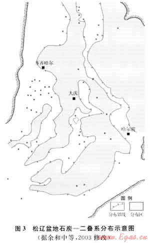 2) 松遼盆地周緣地區(qū)近年來經(jīng)中國石油化工集團公司及吉林大學(xué)等單位研究后認為:東北地區(qū)古生界為一套裂陷-克拉通盆地沉積,古生界分布廣泛(圖3),沒有區(qū)域性變質(zhì),烴源巖十分發(fā)育。通過地質(zhì)調(diào)查,確定在東北地區(qū)東部的磐石、西部的東西烏旗、呼倫貝爾盟和興安盟等地區(qū),晚古生界發(fā)育4套烴源巖系[3]。