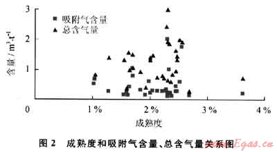 中國海相頁巖具有成熟高的特點(圖1),以中國南方地區(qū)下寒武統(tǒng)黑色頁巖為例,大部分地區(qū)的成熟度大于3%,處于過成熟晚期階段,局部地區(qū)的成熟度均超過4%,達到變質(zhì)期,失去生氣能力[9~11]。雖然局部地區(qū)的成熟度偏高,但是高的有機碳含量預示著這些層位可能是頁巖氣發(fā)育的有利層位,如在黔中隆起的方深1井的下寒武統(tǒng)牛蹄塘組,成熟度(Ro)高達5.5%,有機碳含量高達8.02%,對牛蹄塘組黑色頁巖的壓裂測試表明,仍有天然氣產(chǎn)出。因此,不難看出即使是高成熟度的頁巖,也可能有天然氣賦存。總體來講,高成熟度對頁巖氣藏來說是不利的,在高成熟度條件下,主要看頁巖保存條件的好壞,如果保存條件好,即使成熟度高也能形成頁巖氣藏。筆者對四川盆地及其周緣下寒武統(tǒng)和上奧陶統(tǒng)-下志留統(tǒng)41塊黑色頁巖的成熟度和含氣量的關(guān)系可以看出,成熟度(Ro)介于1.1%~3.0%時,吸附氣含量達到最大值區(qū)域,平均超過1m3/t,最大超過2m3/t,總含氣量也達到最大值區(qū)域,平均超過2m3/t。在小于1.1%和大于3.0%時,吸附氣含量和總含氣量均有不同程度的降低,前者因為處在生油窗(濕氣),生氣量有限且溶解于石油中,后者成熟度過高,生氣能力有限,均導致吸附氣含量不高(圖2)。無論成熟度高低,在頁巖層中,均有天然氣賦存,甚至形成頁巖氣藏。