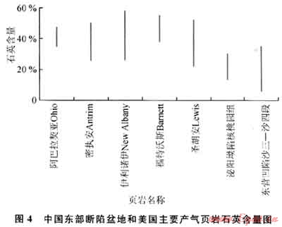 與美國主要產(chǎn)頁巖氣盆地類比,中國陸相頁巖具有分布局限、埋藏普遍較深、脆性礦物含量低、黏土含量高(圖4),具有成藏機理和成藏條件特殊以及不利于后期改造等不利因素,需要在今后的工作中,加強陸相頁巖油氣地質(zhì)理論和開采技術(shù)的研究。