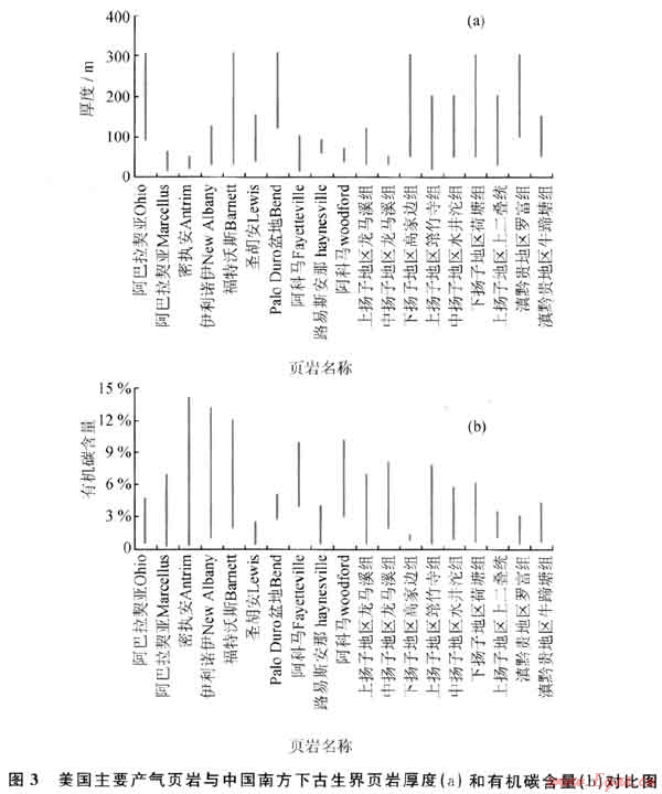 這一差別帶來的問題,一是黑色頁巖的沉積環(huán)境、厚度和展布情況等尚不十分清楚;二是時代老,經(jīng)歷的構(gòu)造運動復雜、熱演化史復雜,頁巖經(jīng)歷了多期次的生排烴,頁巖氣成藏條件復雜;三是頁巖埋深變化較大,從出露地表到埋深超過萬米均有分布。