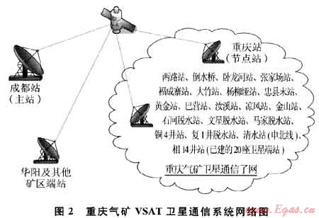 3) 對于新納入到重慶輸氣管網(wǎng)SCADA系統(tǒng)進行監(jiān)控的站場(如地處偏遠且公網(wǎng)難以到達的重要站場)采用VSAT衛(wèi)星系統(tǒng)數(shù)據(jù)傳輸電路作為重慶輸氣管網(wǎng)SCADA系統(tǒng)數(shù)據(jù)傳輸主通道,GPRS數(shù)據(jù)傳輸作為SCADA系統(tǒng)備用數(shù)據(jù)傳輸通道。重慶氣礦VSAT衛(wèi)星通信系統(tǒng)網(wǎng)絡(luò)圖如圖2所示。