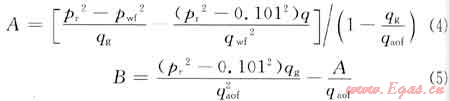 把氣井測試一點獲得的qg、pwf、pr數(shù)據(jù)代入式(7)求B值,再用一般二項式求A值,由此即可求得測試井的二項式和qaof。