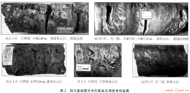 震旦系燈影組下部(燈二段)也有儲層發(fā)育。由于其埋藏較深、含水層較多,以前并未給予足夠重視,對其取得的實物資料較少,研究程度不高。從目前不多的資料來看,它和上部的儲層發(fā)育特征有所差異,主要表現(xiàn)為溶洞規(guī)模降低,孔隙層增多。巖心描述顯示:燈影組向下大型縫洞減少,小型孔洞占據(jù)優(yōu)勢,高科1井燈影組巖心統(tǒng)計,溶洞巖心累計28.57m,其中燈四段11.45m(占40.1%),燈三段12.20m(占42.7%),燈二段4.92m(占17.2%),顯示出向下溶洞發(fā)育減弱。但是在基質(zhì)物性方面,下部儲層有變優(yōu)的趨勢,表明孔隙層增多,借此可以彌補溶洞層減少的不足。