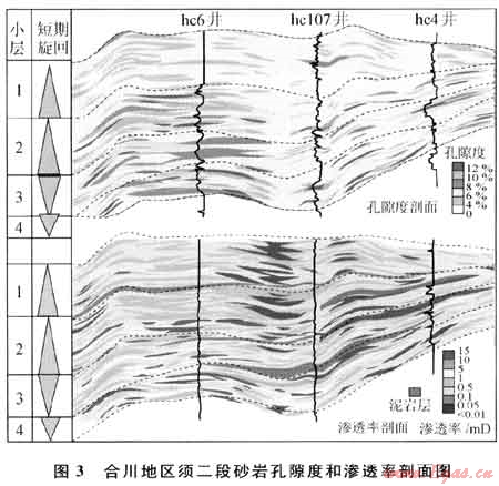 通過建立四川盆地須家河組層序地層格架(圖1),針對合川地區(qū)開展須二段砂巖精細(xì)小層對比(自上而下劃為1~4個(gè)小層)和相控隨機(jī)模擬儲層預(yù)測綜合研究。研究成果顯示(圖3),須二段各小層之間泥巖隔層不發(fā)育,主要發(fā)育含泥細(xì)粒粉砂質(zhì)物性隔層,其內(nèi)部大量致密砂巖分隔體(層)與中高孔滲砂體相互“滲透”和交叉分布。
