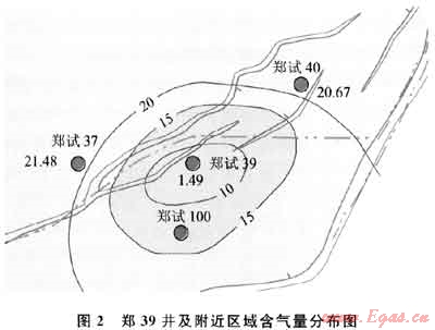 斷層(“陷落柱”)的作用一是對(duì)附近煤層氣有解吸作用,封堵性差可造成煤層含氣量低,但解吸范圍有限,例如鄭試39井位于斷裂帶內(nèi)(圖2),含氣量僅2.5m3/t,主要由于斷層、“陷落柱”煤層氣很快逸散,造成含氣量低;二是近斷層地帶裂縫發(fā)育,通過壓裂易與斷層、地層水或地表水溝通,煤層氣沿裂縫逸散,排采井可能產(chǎn)水量大、產(chǎn)氣量較小或不產(chǎn)氣[5]。