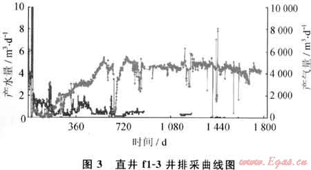 含氣性差異是產(chǎn)量相差較大的主要原因,在構(gòu)造溢散邊界(斷層、“陷落柱”)附近、地下水補(bǔ)給邊界附近,其煤層氣富集條件較差,開發(fā)效果較差。低產(chǎn)井區(qū)位于構(gòu)造溢散邊界,也是地下水補(bǔ)給邊界附近,煤層氣含量低,其富集較差。樊莊區(qū)塊東部井區(qū)煤層氣井處于大氣降水補(bǔ)給邊界,含氣量一般介于5~17m3/t,含氣飽和度低于80%,直井平均產(chǎn)量不足500m3/d。圖1為樊莊區(qū)塊東部1口井的排采曲線,該井排采2年多累計(jì)產(chǎn)氣量僅25×104m3,最高日產(chǎn)氣量還達(dá)不到1000m3。該井區(qū)多數(shù)井生產(chǎn)情況與這口井相似,樊莊區(qū)塊東部井區(qū)單井產(chǎn)量普遍較低的主要原因是含氣量、含氣飽和度低,因此開發(fā)效果較西部差。