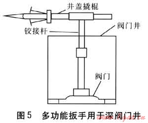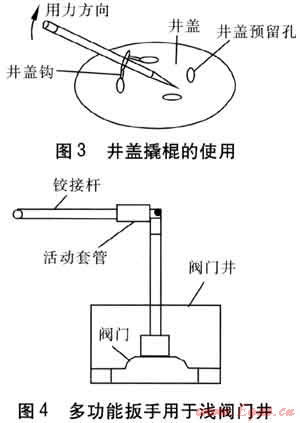 使用時,先用井蓋撬棍組件打開井蓋(見圖3)。如果井蓋的預(yù)留孔有泥土堵塞,可用撬棍的錐頭進行疏通,再選擇合適的T型井蓋鉤鉤住井蓋,然后用力將井蓋向上掀起。根據(jù)井內(nèi)閥門桿的尺寸,選擇合適的正方體套筒的套孔,放入固定套內(nèi),擰緊固定銷,防止正方體套筒從固定套中掉出。而后,將套筒組件放入井中,并使正方體套筒對準閥門,必要時使用井蓋撬棍內(nèi)置的LED強光手電筒幫助照明。當閥門井較淺時,鉸鏈桿無須展開成一條直線,見圖4。當閥門井比較深時,見圖5,應(yīng)全部展開鉸接桿,以加長鉸接桿的長度。需要較大扭矩時,還可將井蓋撬棍插入鉸接桿頂端的旋轉(zhuǎn)手柄內(nèi),增加力臂長度。擰動閥門時,兩手同時扳動手柄,均勻用力將閥門打開或關(guān)閉。