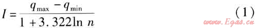 以德州市中心城區(qū)為例進(jìn)行分析,計算居民生活用氣量指標(biāo)。截至2009年底,德州市中心城區(qū)共有居民用戶15.5×104戶,商業(yè)用戶1014戶,工業(yè)用戶72戶,年耗氣量為1370.6×104m3/a。筆者隨機抽取了德城區(qū)199戶、高新區(qū)100戶,共計299戶居民用戶進(jìn)行調(diào)查。由于壁掛爐的用氣量很大,計算居民生活用氣量指標(biāo)時主要以無壁掛爐的用戶作為統(tǒng)計重點。對281戶無壁掛爐用戶的年用氣量進(jìn)行統(tǒng)計,家庭人口平均為3.3人/戶。統(tǒng)計學(xué)中的組距計算公式為:
