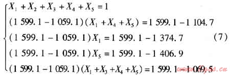 由表4可知,有壁掛爐用戶的用氣量指標(biāo)明顯偏高,燃?xì)鉄崴鲗τ脷饬恐笜?biāo)也有較大的影響。由于壁掛爐和燃?xì)鉄崴鞅入娖鲗τ脷饬恐笜?biāo)的影響大,故只對無壁掛爐、燃?xì)鉄崴鞯募矣秒娖饔脩舻挠脷饬恐笜?biāo)進(jìn)行計算。設(shè)電熱水器、電飯煲、微波爐、飲水機、電磁爐這5種家用電器的影響因子分別為X1、X2、X3、X4、X5,則根據(jù)表4有: