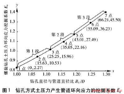 應(yīng)用上述曲線函數(shù)關(guān)系,通過VB軟件可編制出圖形查值軟件,仍以本應(yīng)用實例進行說明。已知鉆孔直徑與管道直徑比Bd/D值(例如Bd/D=1.228),通過圖形對應(yīng)比例關(guān)系,軟件程序計算出與Bd/D值相對應(yīng)的x值。根據(jù)x值,軟件程序自動判定此x值所在曲線段數(shù),依據(jù)該段曲線函數(shù)關(guān)系式,求出相應(yīng)的y值。根據(jù)y值,依據(jù)圖形對應(yīng)比例關(guān)系,軟件程序計算出與其相對應(yīng)的螺旋鉆孔土壓力環(huán)向應(yīng)力挖掘系數(shù)Ee值(Ee=1.24)。