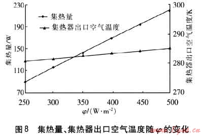 保持其他參數(shù)不變,集熱量、集熱器出口空氣溫度隨φ的變化見圖8。由圖8可知,隨著φ的增大,吸熱板溫度升高,與流道內(nèi)空氣的溫差加大,對流傳熱增強,集熱器出口空氣溫度升高,集熱量也隨之升高。