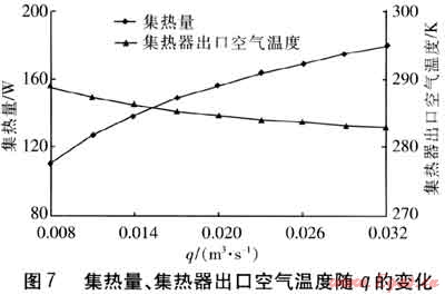 保持其他參數(shù)不變,集熱量、集熱器出口空氣溫度隨q的變化見圖7。由圖7可知,隨著q的增大,集熱器出口空氣溫度降低,這是由于q的增大易導致空氣穿過吸熱板的時間和在集熱器內(nèi)部流動的時間縮短,影響了換熱效果。然而,集熱量一方面取決于集熱器出口空氣溫度與環(huán)境溫度之差,另一方面取決于q。由圖7可知,當q增大時,集熱器出口空氣溫度降低幅度較小,此時q成為影響集熱量的決定因素。因此隨q的增大,集熱量逐漸升高。但在集熱器出口空氣溫度逐漸減小的影響下,集熱量的增長速率是逐漸減緩的。
