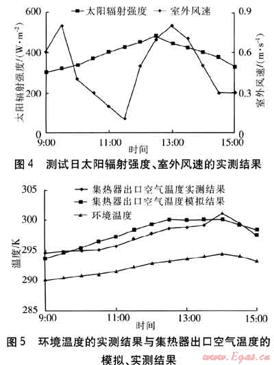選取2009年10月初天氣晴好的一天作為測試日,測試時間為9:00—15:00。測試日太陽輻射強度、室外風速的實測結(jié)果見圖4。環(huán)境溫度的實測結(jié)果與集熱器出口空氣溫度的模擬、實測結(jié)果見圖5。