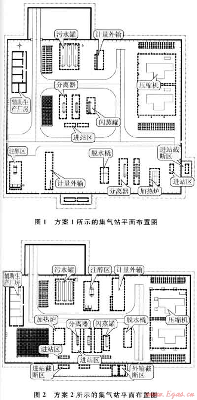 對(duì)比2個(gè)方案可以看出:方案1占地面積大,但上古生界氣藏氣井的集輸流程和上、下古生界氣藏合采氣井的集輸流程分開(kāi)布置,便于管理;方案2占地面積小,設(shè)備布置較為緊湊。對(duì)于新建場(chǎng)站,推薦采用方案用效果還有待觀察。