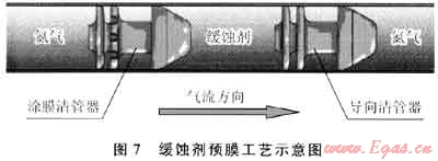 緩蝕劑預膜采用預膜型緩蝕劑與柴油按照1:1比例混合,用預膜球進行作業(yè),合理運行速度控制緩蝕劑與管道內(nèi)壁接觸時間在5~10s,保證緩蝕劑在管道內(nèi)壁形成3~4mil(1mil=25.39999918μm)的緩蝕劑化學膜,預膜工藝見圖7。目前按照30~60d的頻次進行緩蝕劑涂膜。