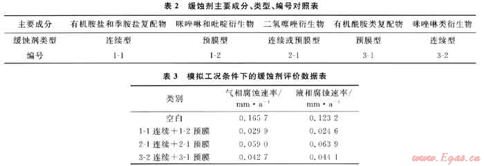 針對國外高含硫氣田已成熟應用的商業(yè)產(chǎn)品,結合普光氣田濕氣集輸工藝的腐蝕特點,選取了連續(xù)型和預膜型2種類型緩蝕劑。根據(jù)緩蝕劑在高含硫介質(zhì)條件下的成膜特性,優(yōu)選了有機胺鹽和季胺鹽復配物、咪唑啉和吡啶衍生物、二氫噻唑衍生物、有機酰胺類復配物、咪唑啉類衍生物共5類緩蝕劑產(chǎn)品,具體類型見表2。