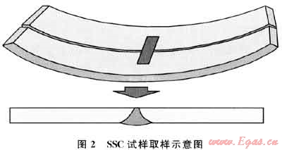 硫化物應力開裂(SSC)試件尺寸:115×15×5(5為壁厚方向)(mm),焊接接頭試樣垂直于焊縫取樣,焊縫位于試樣中部。對于焊接管,應從焊縫、沿焊縫90°、180°部位取樣。以內(nèi)壁為基準取5mm厚的試樣,圖2為SSC試件取樣示意圖。