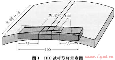 氫致開裂(HIC)試件尺寸:100×20×壁厚(mm),如果有焊縫,焊接接頭試樣應垂直于焊縫取樣,且焊縫應位于試件的中心線上,圖1為HIC試件取樣示意圖。