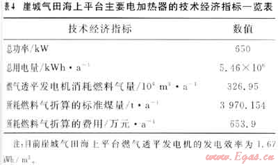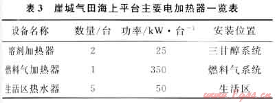 在崖城氣田海上平臺上,除了三甘醇再沸騰器以外,還有一些生產設備和生活設施是需要使用熱源的,其主要電加熱器一覽表見表3。