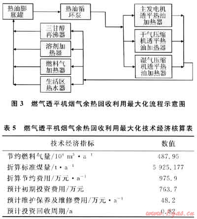 如果將這些熱源用戶全部改造成熱油換熱,并充分回收利用氣田上其他所有燃氣透平機得煙氣余熱,與本文2.3中涉及的熱油循環(huán)系統(tǒng)連成一體,那么將實現(xiàn)燃氣透平機煙氣余熱回收利用最大化,其流程如圖3所示。其相應的技術經濟核算見表5。這將會大量減少燃料氣的消耗量,提高能源的利用率,節(jié)約氣田開發(fā)生產成本,增加崖城氣田的經濟效益,應用前景廣闊。