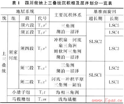 四川盆地須家河組2個(gè)超長(zhǎng)期旋回分別對(duì)應(yīng)于須家河早期(以安縣運(yùn)動(dòng)侵蝕面為界[3],沉積T3x2-T3x3,俗稱須下盆)和須家河晚期(沉積T3x4-T3x6,俗稱須上盆)2個(gè)成盆期構(gòu)造層序。長(zhǎng)期基準(zhǔn)面旋回與vail經(jīng)典層序理論中的Ⅲ級(jí)層序相當(dāng),是一套具較大水深變化幅度的、彼此間具成因聯(lián)系的地層所組成的區(qū)域性湖進(jìn)湖退沉積序列,可稱為沉積層序,5個(gè)長(zhǎng)期旋回層序宏觀上對(duì)應(yīng)于須二、須三、須四、須五、須六段。